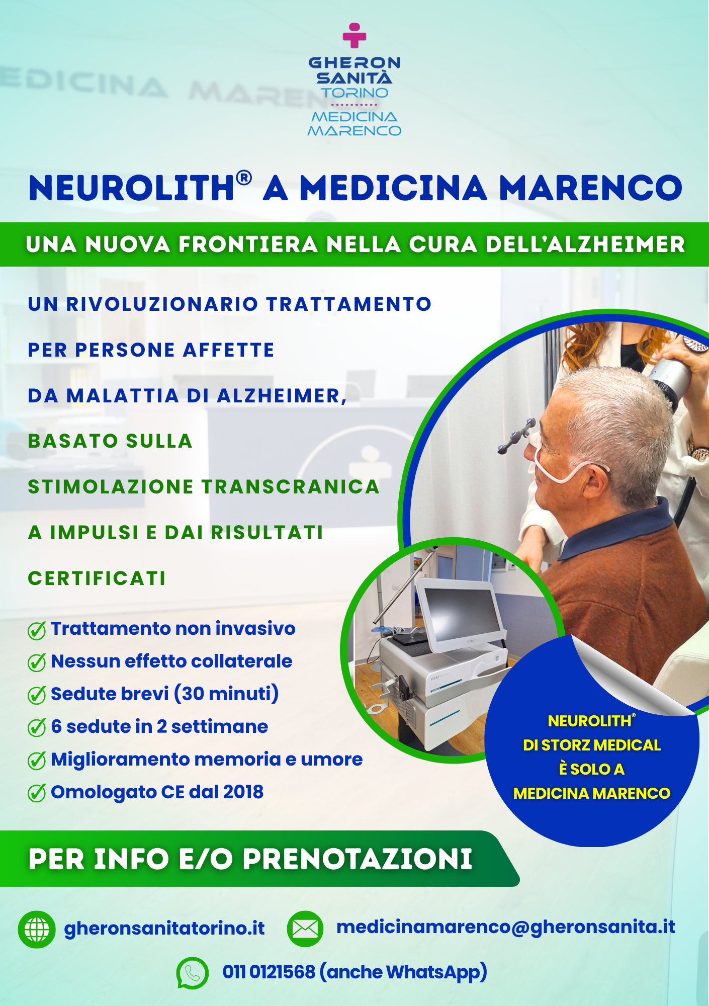 A partire da luglio 2024, Medicina Marenco conferma la sua vocazione all’innovazione con l’introduzione di Neurolith®, il trattamento rivoluzionario dedicato alle persone affette da malattia di Alzheimer. Si tratta di una tecnologia all’avanguardia, omologata CE, sviluppata da Storz Medical, azienda svizzera leader mondiale nella terapia a onde d’urto.