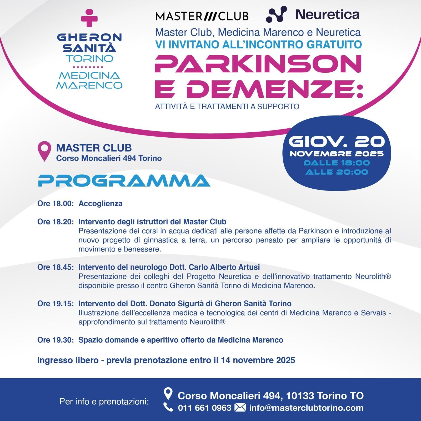 Giovedì 20 novembre 2025, dalle ore 18:00 alle 20:00, il Master Club di Torino ospiterà un incontro gratuito dedicato a un tema di grande attualità e sensibilità: “Parkinson e demenze: attività e trattamenti a supporto”.